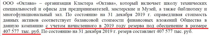 К сожалению, ПАО «Октава» под управлением «эффективных менеджеров» Ростеха не всегда добросовестно информирует о своей деятельности (см. материал «Ростеховские обнуляшки»). Учитывая значительные убытки, которые понесло само ПАО «Октава» в 2019 году, можно предположить, что «эффективные менеджеры» Ростеха закрыли глаза на обесценение вклада в уставный капитал ООО «Октава», чтобы не увеличивать убытки в отчетности.