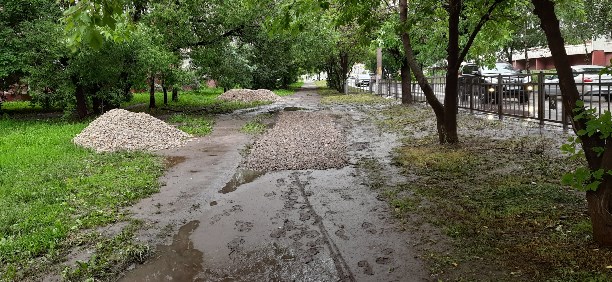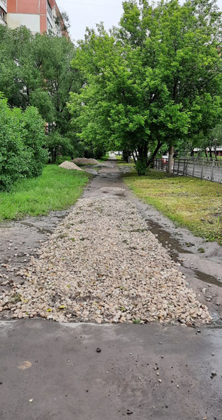 За три месяца где-то нашлось немного щебёнки, и каким-то образом эту щебёнку немного раскидали по ямам.