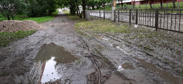 Вот фото с места, на расстоянии несколько метров, в сторону ул. Каракозова. И обратите внимание — нет даже скромных попыток присыпать лужицы щебёночкой. И правда, зачем? Руководство про эту лужу распоряжений не давало, а люди перепрыгнут 🙂