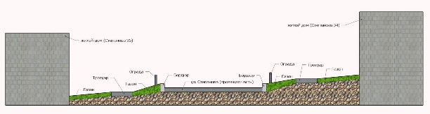 Профиль улицы Степанова. Дорога идёт поперёк уклона местности и вода стремиться от стороны с домом № 34 к стороне с домом № 35.