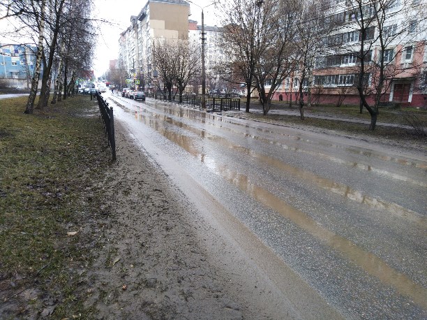 Проезжая часть ул. Степанова имеет очень большую колейность (это такие продольные канавы в асфальте, которые образовались из-за постоянного давления колёс автомобилей). В колеях скапливается вода:
