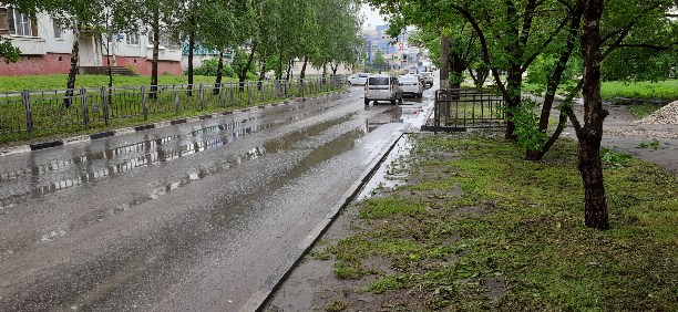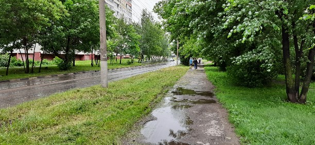 Газон, который со стороны дома № 35 находится ниже чем проезжая часть, и вода с него течёт на тротуар и дальше. При этом тротуар работает как дамба и собирает лужу, которая ещё больше портит и тротуар и газон: