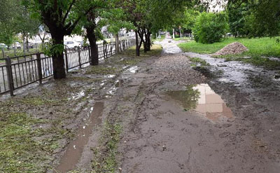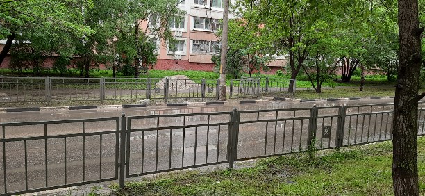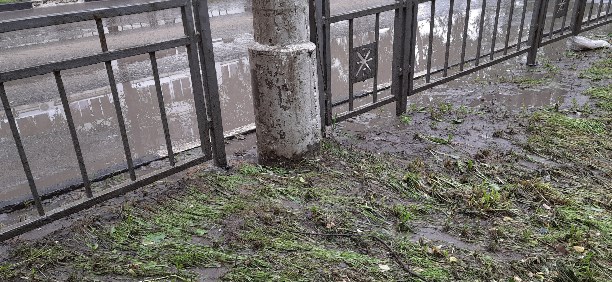 Предлагаю сделать этот забор сплошным, чтобы вода с проезжей части не выливалась на газон, а возвращалась на проезжую часть и уходила потом в ливнёвку. Хотя бы со стороны дома № 35, там где с тротуаром самая большая беда.