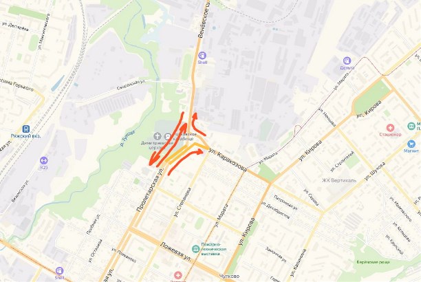 Чтобы не образовывалась колейность — надо убрать с ул. Степанова поток большегрузного транспорта. Для этого надо организовать движение с Венёвского шоссе сразу на ул Пролетарская. Вот пример из мартовского блога. (как и тогда писал, рисовать схему тщательно — лень. но думаю что мысль понятна):
