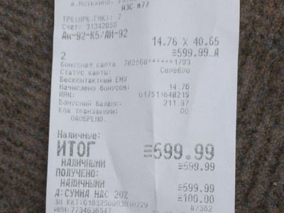 Житель Тулы Андрей А. выложил в соцсетях снимок чека, выданный ему после заправки автомобиля на одной из АЗС в Калужской области.
