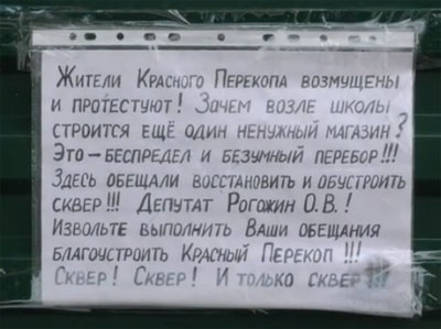 Рядом с этим объявлением появилось рукописное воззвание, где строительство очередного ТЦ названо безумным перебором. Кроме того, возмущенные жители просят депутата от своего округа Олега Рогожина исполнить предвыборные обещания и обустроить на этом месте сквер.