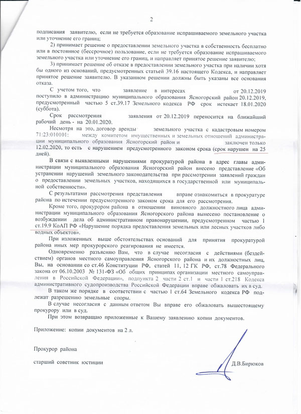 Так, в ходе проверки Прокуратурой Ясногорского района установлено нарушение срока, подготовки документов заявителю, на 25 дней. В связи с этим, прокурором района, в отношении виновного должностного лица администрации МО Ясногорский район, вынесено постановление о возбуждении дела, предусмотренном ч.1 ст.19.9 КоАП РФ.