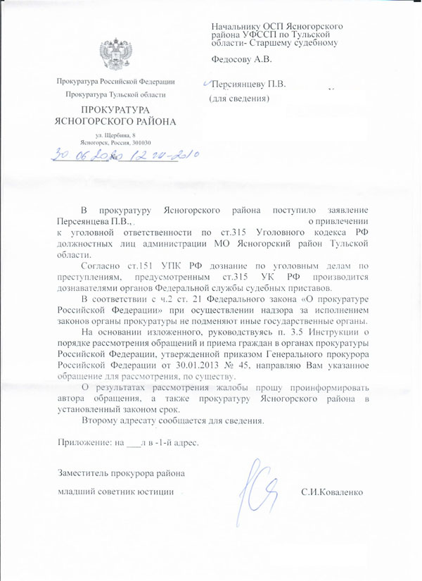 В период выполнения своих должностных обязанностей, в администрации Ясногорского района, Ерохиной Н.С. не раз делались устные замечания депутата Персиянцева П.В. о соблюдении сроков, для предоставления ответа на заявления граждан. Однако должного исполнения не последовало.