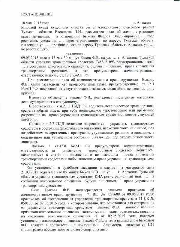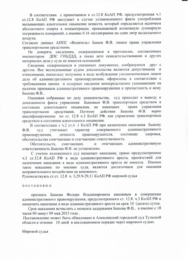 Также, в сети интернет найдено Постановление в отношении Быкова Федора Владимировича, в признании последнего виновным и назначении наказания в виде административного ареста на срок 10 суток, за управление транспортным средством в состоянии алкогольного опьянения, будучи лишенным водительских прав. Злостный нарушитель или вседозволенность в родном городе?