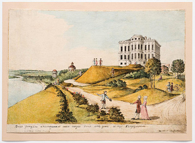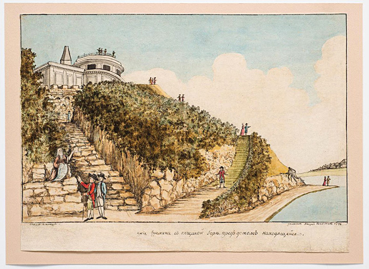 Андрей Болотов, Павел Болотов. «Вид рондаля и по сторонам оного сходов вниз от дома в саду Богородицком». Лист из альбома «Виды имения Бобринских Богородицк». 1786–1787. Фото: Государственный исторический музей