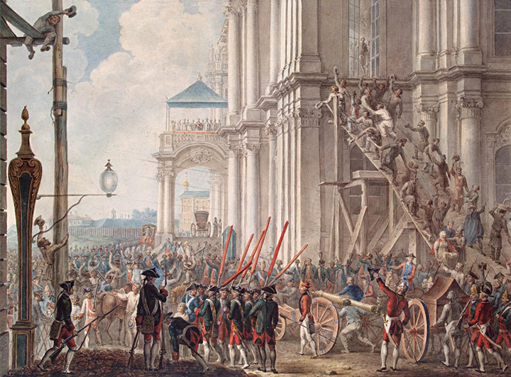 Неизвестный художник. «Екатерина II на балконе Зимнего дворца, приветствуемая гвардией и народом в день переворота 28 июня 1762 года». Конец XVIII — первая треть XIX в. Фото: Государственный Эрмитаж