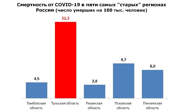 Огромная разница в показателе смертности и с соседней Рязанской областью: в Тульской области смертность от COVID-19 в 5,6 раз выше.