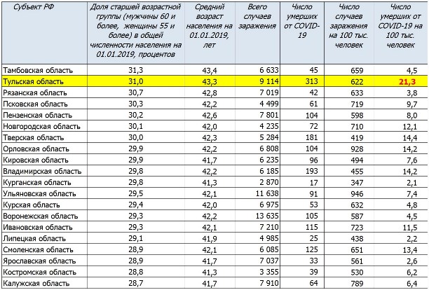 Как видно из таблицы, наша область не самый «старый» регион России, но при этом число умерших от COVID-19 (на 100 тыс. человек) в Тульской области почти в 5 раз больше, чем в самом «старом» российском регионе – Тамбовской области. Причем в Тамбовской области число случаев заражения (на 100 тыс. человек) даже выше, чем в нашей.