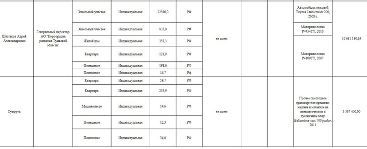 Стали известны доходы генерального директора «Корпорации развития Тульской области» Андрея Шестакова в 2019 году. В опубликованной декларации указан годовой доход — 10 681 180 рублей. Андрей Шестаков владеет двумя земельными участками 22 586 и 835 квадратных метров, жилым домом и квартирой (353,3 и 121 кв. метр соответственно), а также двумя помещениями. Также в собственности главы корпорации внедорожник Toyota Land cruiser 2008 года выпуска и две моторные лодки.
