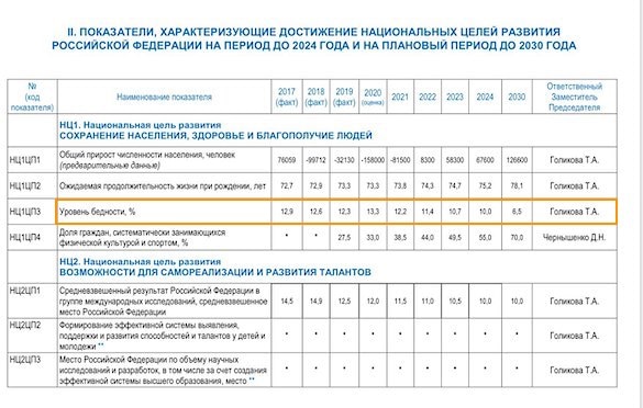 План национальных проектов, утвержденный в 2018 году, требовал снизить уровень бедности в этом году до 11,1%, а к 2024-му довести его до 6,6% — минимума в новейшей истории страны.