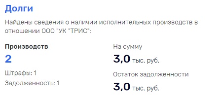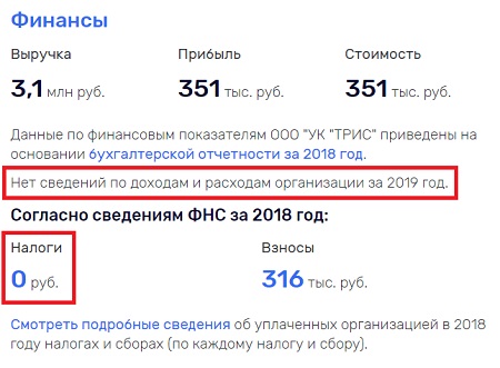 12. ООО УК «ТРИС» (г.Тула) — в 2018 году прибыль 351 тысяча рублей, однако сумма выплаченных налогов 0, за 2019 год отчетность полностью отсутствует, исковые требования на 79 тысяч рублей, исполнительные производства на 3 тысячи рублей.