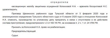 На сайте Первого кассационного суда общей юрисдикции появился текст очередного определения с отменой обвинительного приговора и признанием права на реабилитацию.