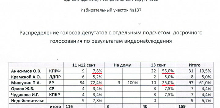 Между тем, если взять итоги только за 13 число, откинув досрочное голосование, то практически на всех участках Олег Анисимов набрал более 50 процентов голосов. Таким образом если брать один день 13 сентября, то Олег Анисимов набрал голосов больше Павла Мишунина почти в два раза и победил.
