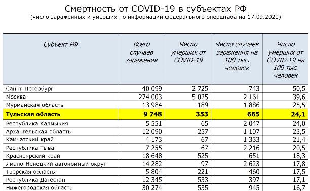 3. Очень большое число зараженных в действительности по сравнению с другими регионами. Число зараженных в отчетах существенно уменьшили, чтобы не выделяться на фоне других регионов, но число умерших в отличие от числа зараженных скрыть невозможно. Поэтому умерших в Тульской области гораздо больше, чем в других регионах. К тому же, из-за большого числа зараженных и, следовательно, госпитализированных тульская медицина не смогла уделить всем больным достаточное внимание, и это послужило одной из причин повышенной летальности.