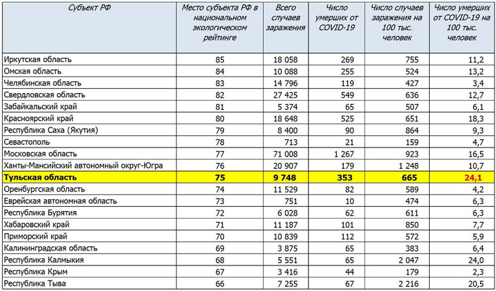 Как видно из таблицы, смертность от коронавируса в самых экологически неблагополучных регионах очень разная: самая большая — в Тульской области, а в Крыму – на порядок ниже. Это можно объяснить как необъективностью рейтинга, в котором Крым отнесен к самым экологически неблагополучным регионам, так и другими факторами.