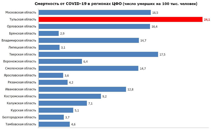 В Тульской области самая высокая смертность от COVID-19 (на 100 тыс. человек) среди регионов ЦФО без учета Москвы. Среди всех субъектов РФ Тульская область по смертности от COVID-19 занимает 4-е место после Санкт-Петербурга, Москвы и Мурманской области. Но Москва и Санкт-Петербург – это города с высокой плотностью населения, а Мурманская область отличилась из-за вспышки коронавирусной инфекции среди строителей на гигантской стройке НОВАТЭКа в Белокаменке.