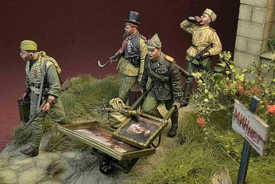 Теперь появился этот фантастически гнусный набор солдатиков. Стремясь представить военнослужащих Красной Армии как преступников-грабителей, их одели в какую-то мешанину из советской формы разных лет. Один из них везет в тачке украденный антиквариат, другой тащит чей-то чемодан, третий напялил на себя цилиндр, жилетку и обмотался галстуками, четвертый просто хлещет алкоголь из бутылки. Вот такое представление о советских солдатах должны получить европейские дети, которые будут играть с этими фигурками.