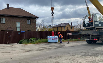 Бетонный цилиндр весом 5 тонн с надписью «Долг за газ» [20 октября] с помощью спецтехники установили возле двухэтажного коттеджа на Гарнизонном проезде.
