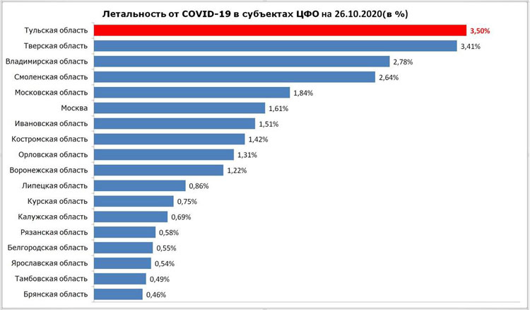 Тульская область занимает печальное 1-е место по летальности от COVID-19 среди всех субъектов ЦФО.