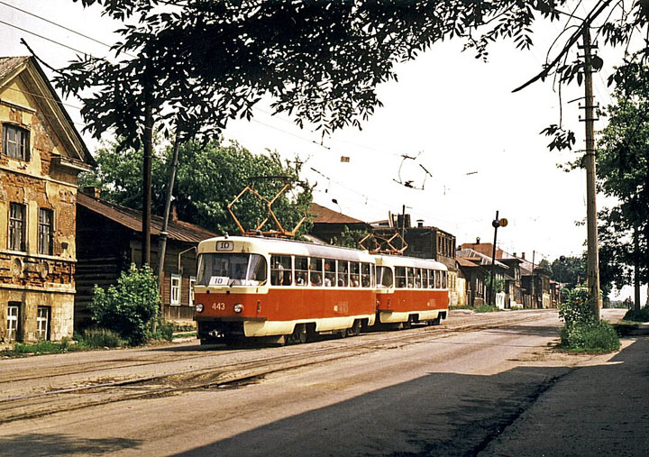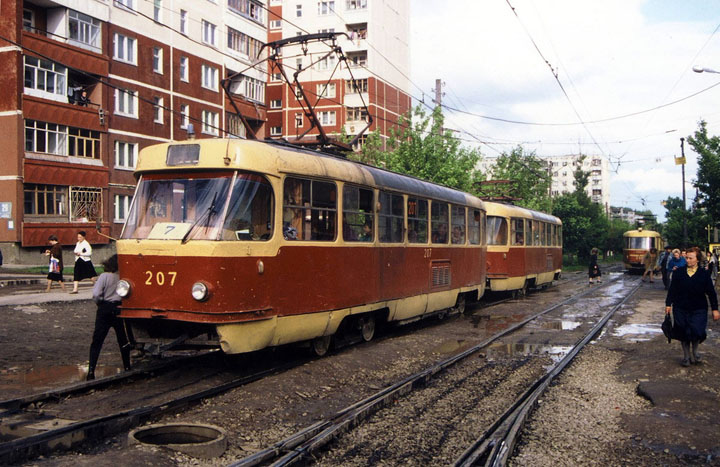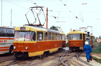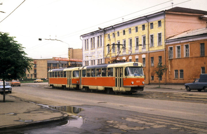 Трамваи тех лет были исключительно «Татры» и исключительно красно-желтые (хотя оттенки были разные и вместо красного мог быть бордовый цвет, а вместо желтого светло-розовый).