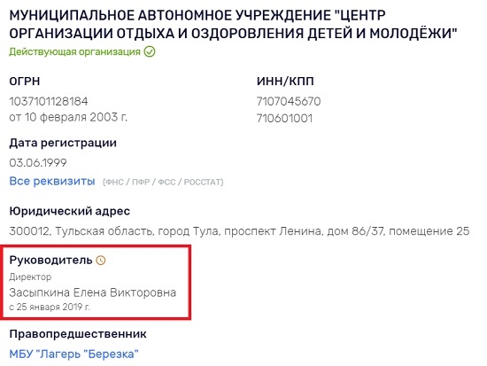 ТК «ТУЛЬСКАЯ ПОЛИТИКА» в своем посте «Царство Засыпкиной» сообщает ряд любопытных фактов, которые могут говорить о серьезных нарушениях в деятельности МУНИЦИПАЛЬНОГО АВТОНОМНОГО УЧРЕЖДЕНИЯ «ЦЕНТР ОРГАНИЗАЦИИ ОТДЫХА И ОЗДОРОВЛЕНИЯ ДЕТЕЙ И МОЛОДЁЖИ».