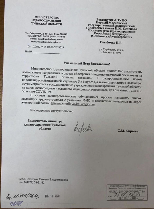«Уважаемый Петр Витальевич! Министерство здравоохранения Тульской области просит Вас рассмотреть возможность направления в случае обострения эпидемиологической обстановки на территории Тульской области, связанной с распространением новой коронавирусной инфекцией, студентов 5 и 6 курсов, а также ординаторов желающих трудоустроиться в государственные учреждения здравоохранения Тульской области на должности среднего и младшего медицинского персонала для оказания помощи больным COVID-19. В случае заинтересованности обучающихся просим направить список желающих трудоустроиться с указанием ФИО и контактных телефонов на адрес электронной почты: …@tularegion.ru. Благодарим за сотрудничество. Заместитель министра здравоохранения Тульской области С.М.Киреева».