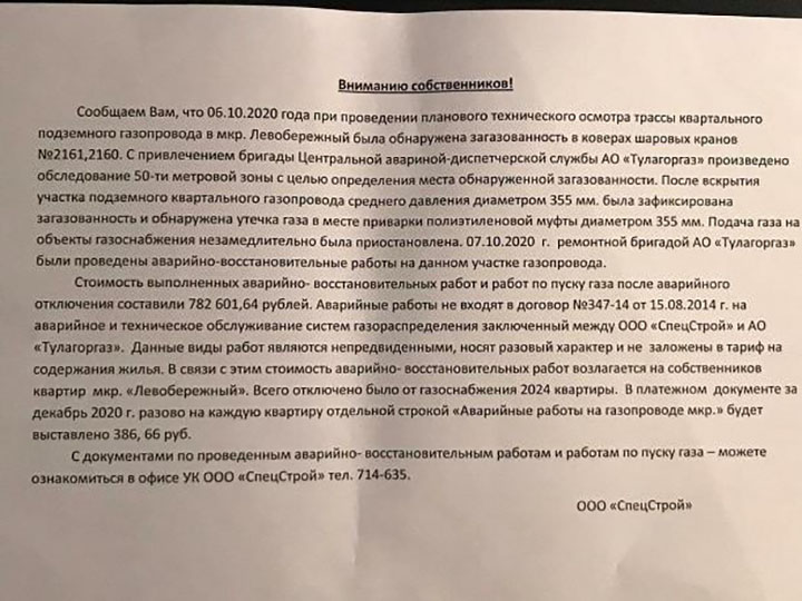 В конце ноября жители получили уведомление от управляющей компании о том, что в декабре им будет выставлен счет за устранение октябрьской аварии. Их предупредили, что с каждой квартиры надо будет заплатить по 386,66 руб.