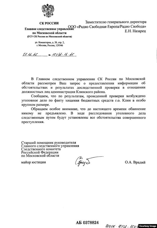Следственный комитет возбудил уголовное дело о хищении бюджетных средств после публикации Радио Свобода о фиктивном трудоустройстве знакомых главы подмосковного Клина. Об этом сообщается в ответе Главного следственного управления ведомства по Московской области на запрос радиостанции.