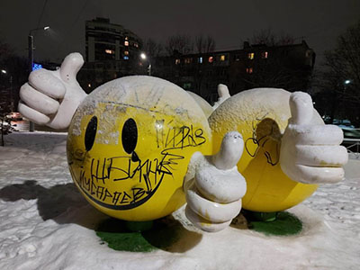 Известный всем тулякам улыбчивый маскот [узнаваемый персонаж] приглянулся вандалам, по всей видимости перепутавшим гигантские смайлы с заборами и стенами.