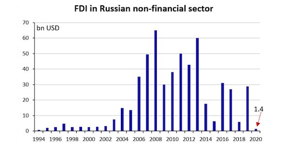 Как итог: в 2020 году Россия зафиксировала чистый отток ПИИ на 4,8 млрд долларов, который почти полностью нивелировал приток предыдущего года (6,3 млрд долларов).