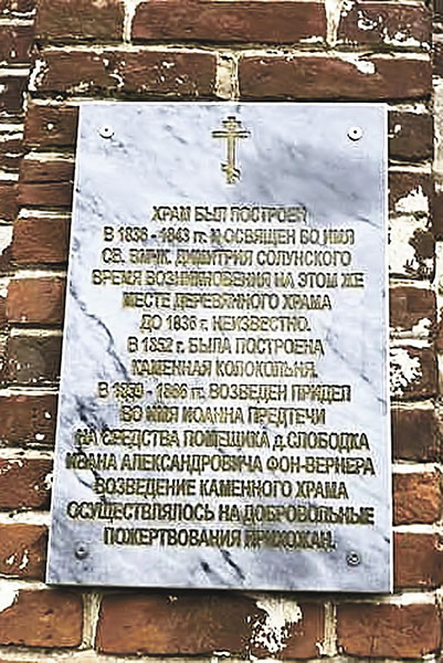 А в 1895 году в описи приходов и церквей Тульской епархии об этом храме написано, что приход его «1210 человек мужского и женского полу. Крестьяне занимаются землепашеством, изготовлением телег, колес и саней. До 1836 года сельский храм был деревянный. По причине древности и ветхости в 1836 году на средства прихожан началось строительство нового каменного». И построили за 7 лет, освятив в 1843 году. Вот в том самом виде храм великомученика Димитрия Солунского так и стоит до сих пор.
