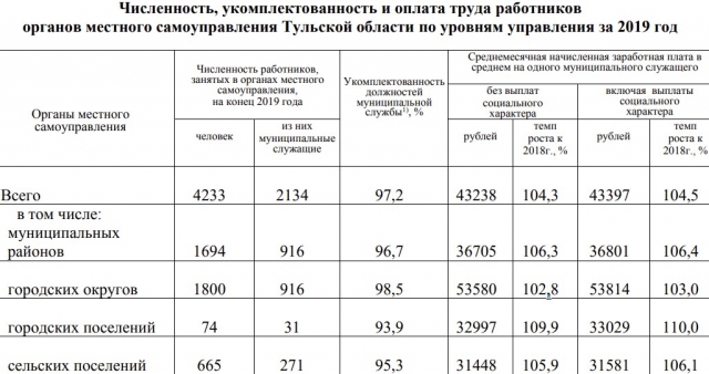 Муниципальные служащие за 2019 год в среднем заработали по 43,4 тыс. руб. Выше других зарплаты в городских округах – Тула, Новомосковск, Алексин, Ефремов. Правда, есть ещё небольшие Новогуровский и Славный, но там просто чиновников немного и даже своими относительно невысокими зарплатами они статистику вниз не тянут. А средние по округам 53,8 тыс. руб. дают, конечно, Тула и Новомосковск. В муниципальных районах региона чиновники получают 36,8 тыс. руб. В городских поселениях (а там местных администраций раз-два и обчёлся, в остальных функции переданы в район) в среднем вышло 33 тыс. руб. в месяц. А самые низкие зарплаты предсказуемо оказались в сельских поселениях – 31,6 тыс. руб.