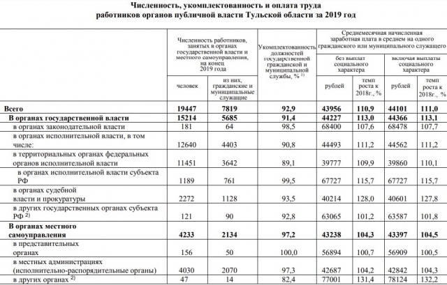 Итак, к этому времени в Тульской области насчитывалось 19 447 работников органов публичной власти. Сюда вошли территориальные подразделения федеральных ведомств – того же Росстата, ФАС, Роспотребнадзора, Росздравнадзора, Роскомнадзора, Ростехнадзора, «пиджаки» из прокуратуры и судейские чины. Здесь же сотрудники аппарата правительства и иных органов госвласти региона – исполнительных, законодательного, счётной палаты, облизбиркома, аппарата уполномоченных по правам. В это же число «зашиты» работники местных администраций и небольших аппаратов представительных и контрольно-счётных органов.