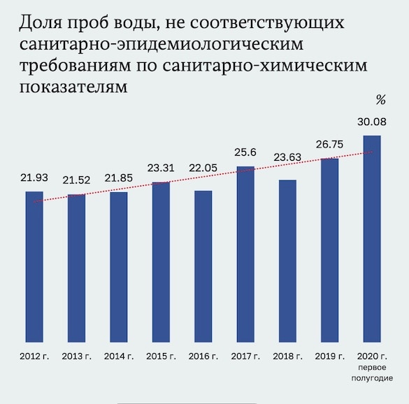 Одновременно растет доля проб проб воды, не соответствующих требованиям по санитарно-химическим показателям. Если 8 лет назад их было 21,91%, то в прошлом году — уже 30,08%.