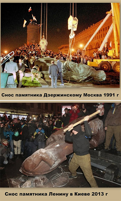 Правильно! Это Украина 2014-го. Что мы там видели? Мощнейшее либеральное лобби — раз. Радикально антисоветский правый движ — два. Крыша в верхах — три. И ритуальная совместная борьба с советскими памятниками.