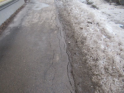 Заметил, прогуливаясь по городу, одно неприятное явление – разрушение асфальтового покрытия тротуаров по краям. Обратил на это внимание в разных частях города, на тротуарах, уложенных 6 лет назад и отремонтированных в прошлом году. Разрушение выражается в появлении трещин разного размера и ширины на асфальтовом покрытии. Причем именно на краях тротуара.