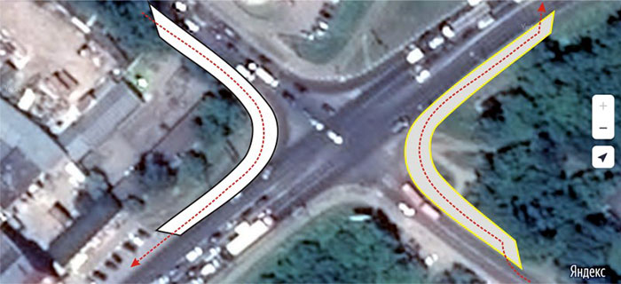 Ширина дороги в этом месте не позволяет автомобилистам уйти направо, под стрелку, так как дорога здесь шириной в один комариный ***. А зимой ещё меньше.