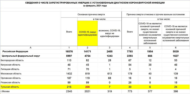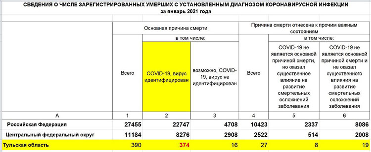 А если просуммировать все месячные данные Росстата, начиная с апреля прошлого года, то всего по январь 2021 года включительно в Тульской области умерли от коронавируса 1466 человек.