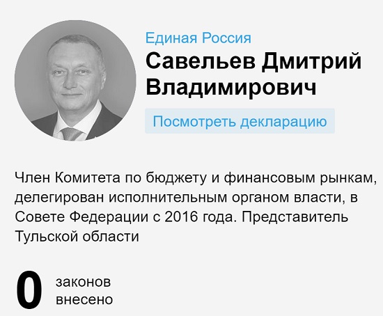 А член комитета Совета Федерации по бюджету и финансовым рынкам Савельев Дмитрий Владимирович, внёсший 0 законов, в исследовании был отнесен к группе интересов топливной промышленности.