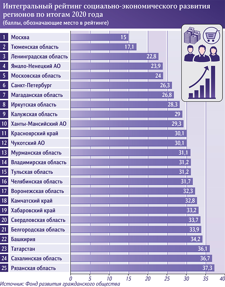 Москва заняла первое место среди регионов России по социально-экономическому и экономическому развитию в 2020 году. Об этом говорится в интегральном рейтинге, составленном Фондом развития гражданского общества на основании данных Росстата, Росказны, Минфина и ФНС (имеется в распоряжении «Известий»).