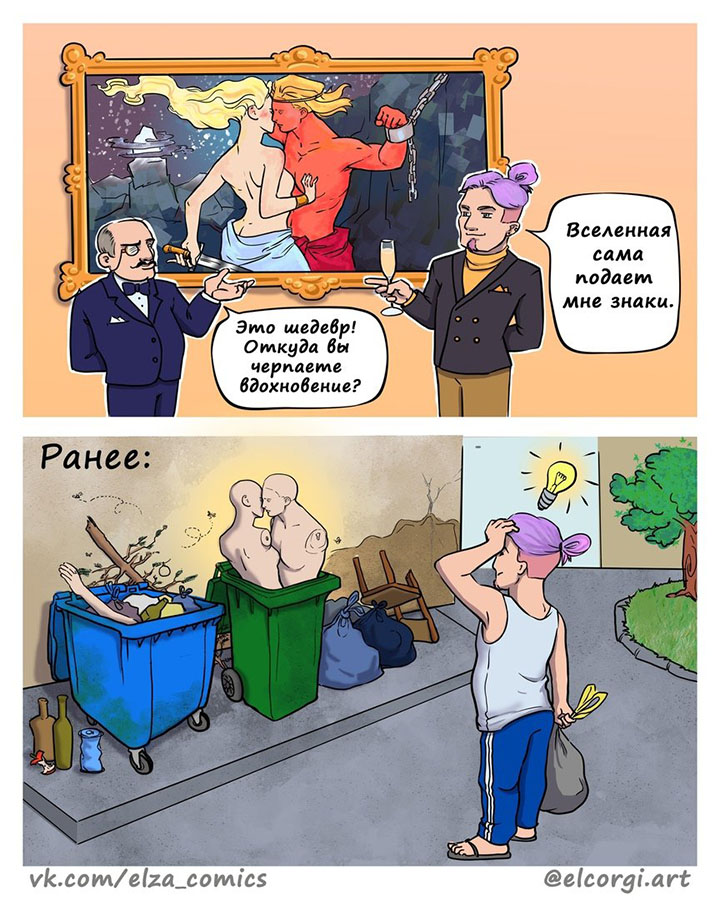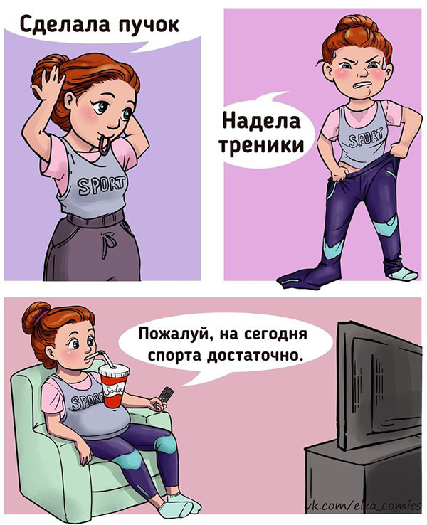 Лера рисует забавные комиксы о различных жизненных ситуациях, что-то про спорт, что-то про молодеющие болячки, есть про нелогичное мышление, а также про самообман. Главной героиней комиксов выступает рыжеволосая девушка, как часто бывает, художник рисует главного героя в прообразе себя, так что и здесь может быть нечто подобное. Сейчас рассмотрим несколько её работ.