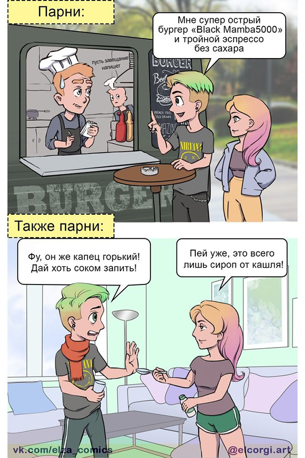 Логика парней конечно иногда поражает, а возможно это простая, человеческая вредность. Так например мужчины могут есть с удовольствием острую пищу, зато как лекарство выпить, так оно горькое и не вкусное.