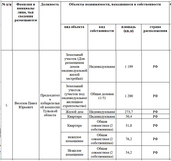 Вот информация о доходах, расходах, об имуществе и обязательствах имущественного характера председателя избирательной комиссии Тульской области Павла Веселова за 2019 год: