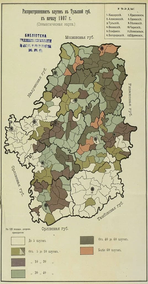 В Тульской губернии в 1907 году на 100 лошадных дворов приходилось в среднем 40 плугов. Остальные пахали деревянной сохой. Ещё надо учитывать, что до 15% дворов были безлошадных (абсолютная нищета даже по меркам бедной деревни).