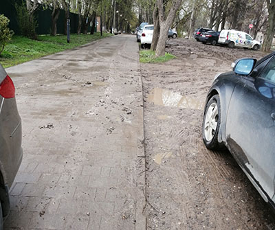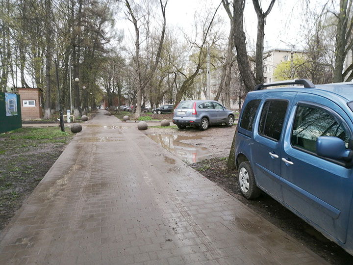 Пару лет я пишу в администрацию просьбы — заблокировать въезд на тротуар и на газон на Ф.Энгельса. И полусферы действительно появляются. Но этой зимой полусферы были сдвинуты, видимо для уборки снега на тротуаре. Ожидаемо, весной их на место никто не поставил.